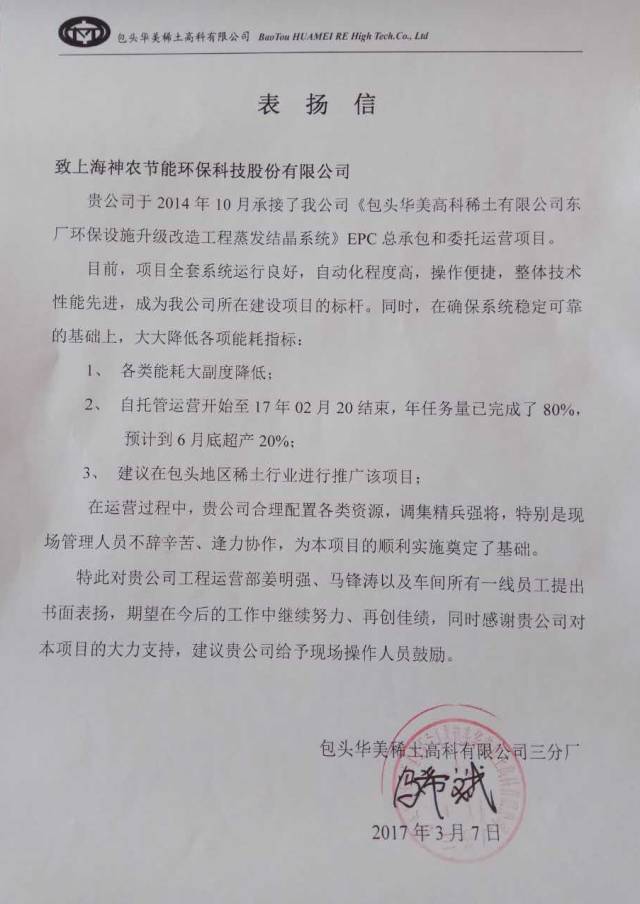 2014年10月,上海神农股份承接了《中国北方稀土(集团)高科技股份有限公司华美稀土高科东厂环保设施综合升级改造项目氯化铵废水蒸发结晶处理系统》epc总承包和委托运营项目。上海神农负责系统设计、设备制造、采购、安装、调试、托管运营、直至移交验收。