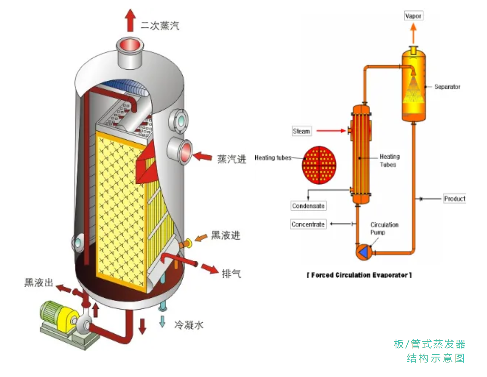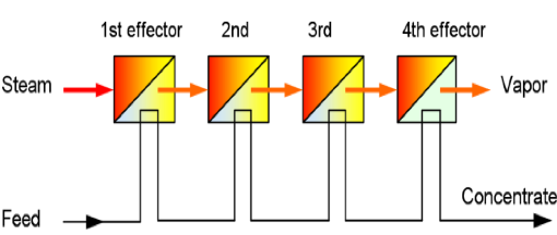 通过将多个蒸发器串联的结构,以各蒸发器(effecter)所产生的水蒸气作为相邻的下一个蒸发器的热源来使用。即只向第一个蒸发器供应蒸汽,然后通过连锁的蒸发达到相当于串联蒸发器数量的蒸发量,蒸汽效率也相应提高数倍(蒸汽消耗对比总蒸发量)。